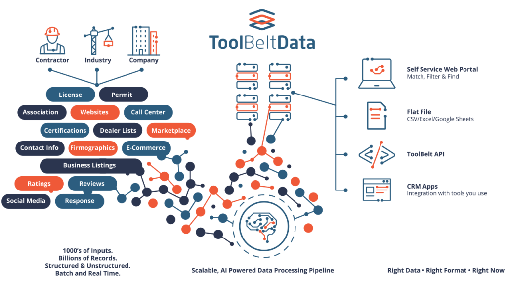 We knew there must be a better way. And we suspected many other B2B marketers were as frustrated as we were and might embrace a solution. Founded by a team of building products, data and technology experts, ToolBelt Data solves these data and analytic challenges. The ToolBelt Contractor Universe (TCU) and ToolBelt Atlas Data Platform delivers contractor intelligence to drive sales success. TCU offers unprecedented breadth/depth by combining more than ten thousand sources and billions of records. Our AI powered data processing pipeline integrates these disparate data sets to construct a true 360° profile of each contractor. On-demand access is provided via web, API, and integrations with popular CRM applications.